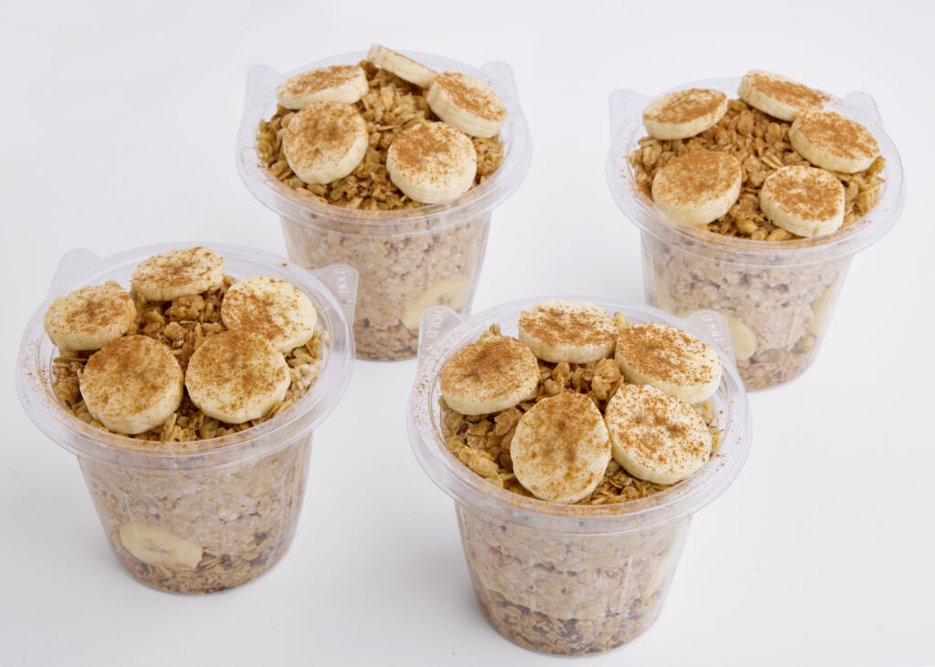 Overnight Oatmeal (almond mylk & oats) layered with granola, bananas, cinnamon, honey. Served Chilled