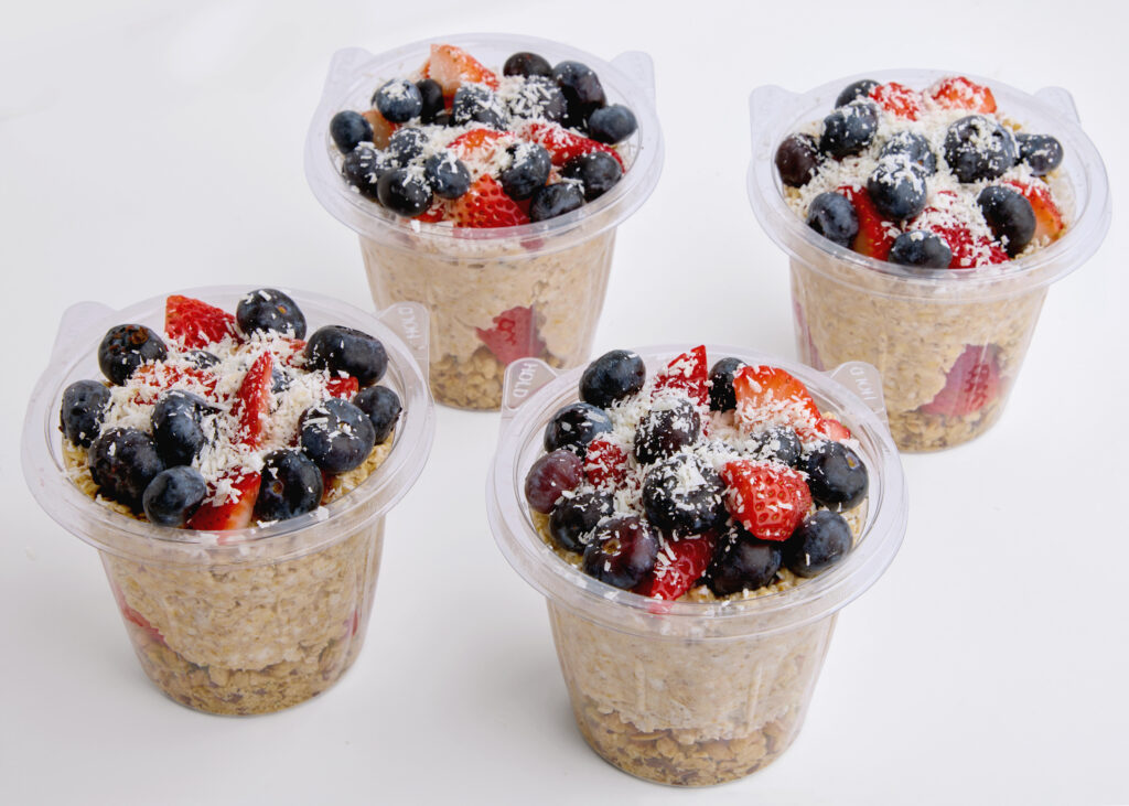 Overnight Oatmeal (Almond Mylk & Oats) layered with Granola, Blueberries, Strawberries, Coconut Flakes, Honey. Served Chilled