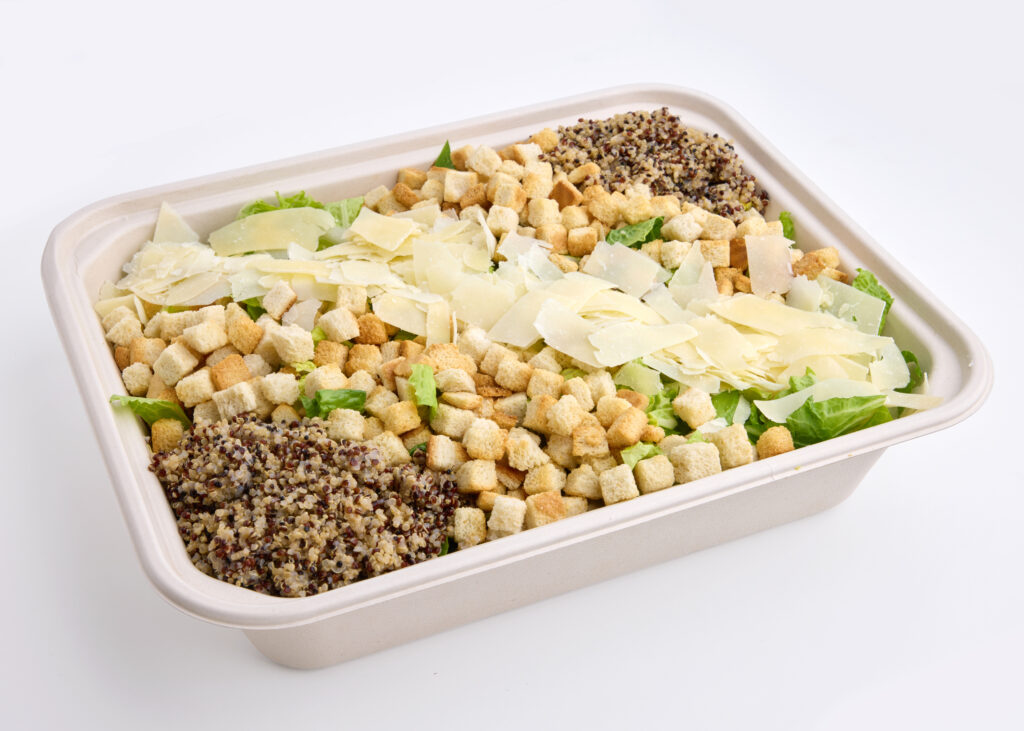 Flour tortilla, romaine, tri-color quinoa, parmesan cheese, croutons, grilled chicken, and caesar dressing* (*contains dairy). Served chilled