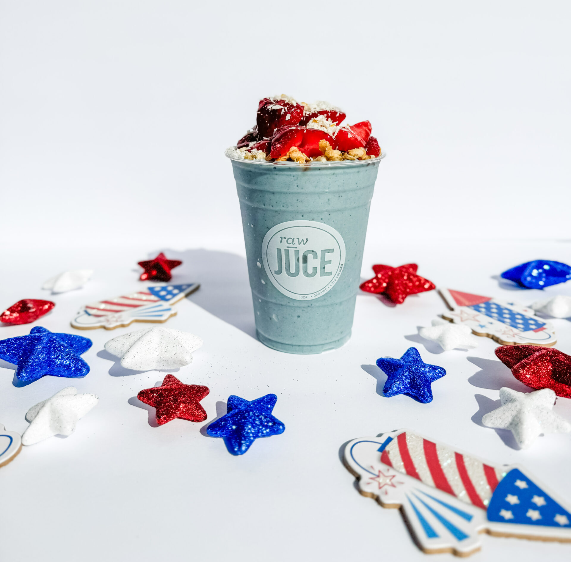 Get ready to light up your taste buds with our latest creation, Firework Fuel! This vibrant and nutritious smoothie is designed to energize your summer days and nights. Packed with a powerhouse blend of ingredients, Firework Fuel starts with a creamy base of banana, almond mylk, and oat mylk. We’ve added a dash of Blue Majik for a stunning color and nutrient boost, along with almond butter for healthy fats and protein powder to keep you fueled.