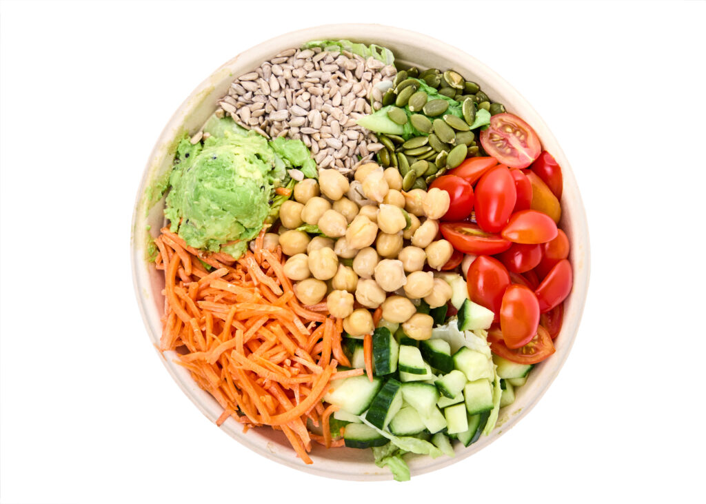 Romaine, Quinoa, Cucumber, Carrots, Tomatoes, Pepitas, Sunflower Seeds, Avocado, Chickpeas, Cashew Ranch Dressing