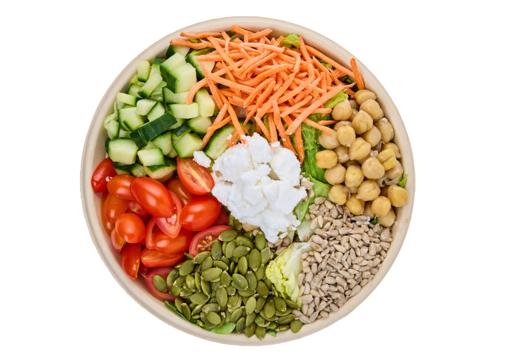 Romaine, Quinoa, Cucumber, Carrots, Tomatoes, Pepitas, Sunflower Seeds, Vegan Feta, Chickpeas, Caesar Dressing